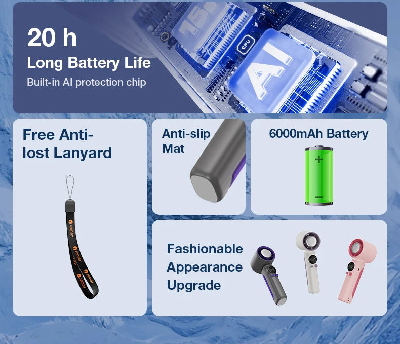 The device is powered by a high - capacity battery that provides an impressive 20 - hour long battery life. This means you can enjoy continuous cooling for an entire day without having to worry about recharging frequently. Additionally, the built - in AI protection chip safeguards the battery from overcharging, over - discharging, and short - circuits. The AI chip constantly monitors the battery's status and adjusts the charging and discharging process accordingly, extending the battery's lifespan and ensuring safe operation.