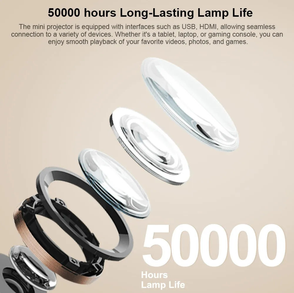 The projector is equipped with a powerful fans and cooling system, extending the lamp life to 50000 hours, ensuring long-lasting performance.